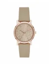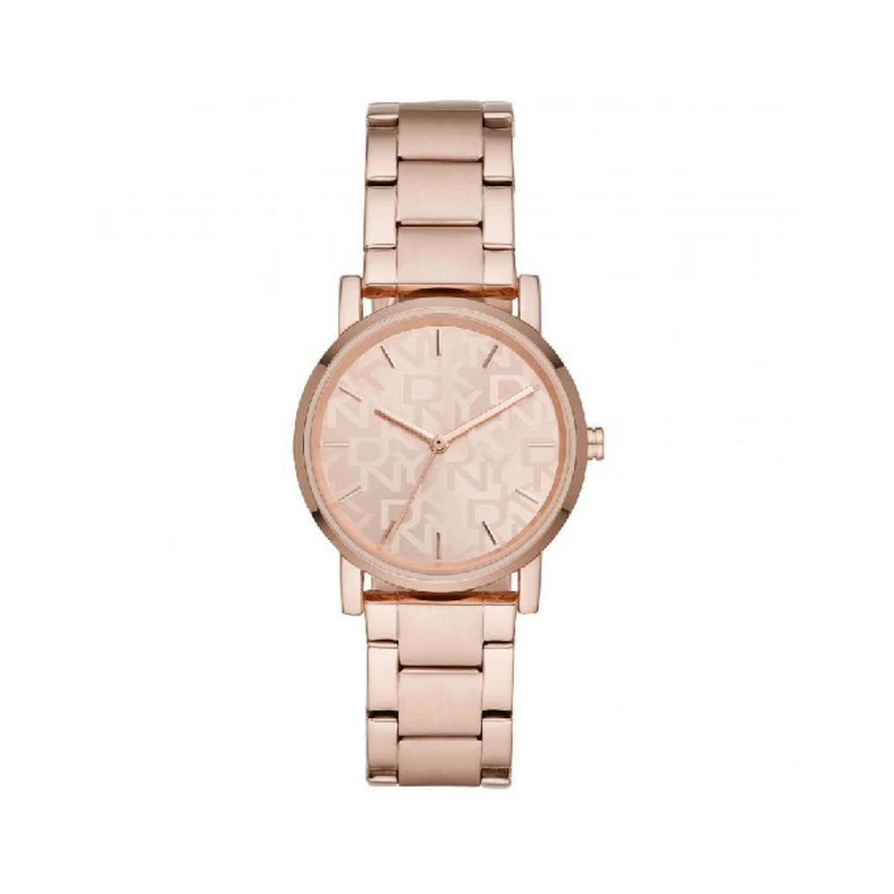 Kućište i narukvica izrađeni su od nehrđajućeg čelika u rozo-zlatnoj tonalitetu (rosé gold-tone) — brojčanik takođe prati tu nijansu sa sun-ray efektom i uzorkom logotipa DKNY. Mineralno staklo pruža zaštitu brojčaniku i održava stil sata.