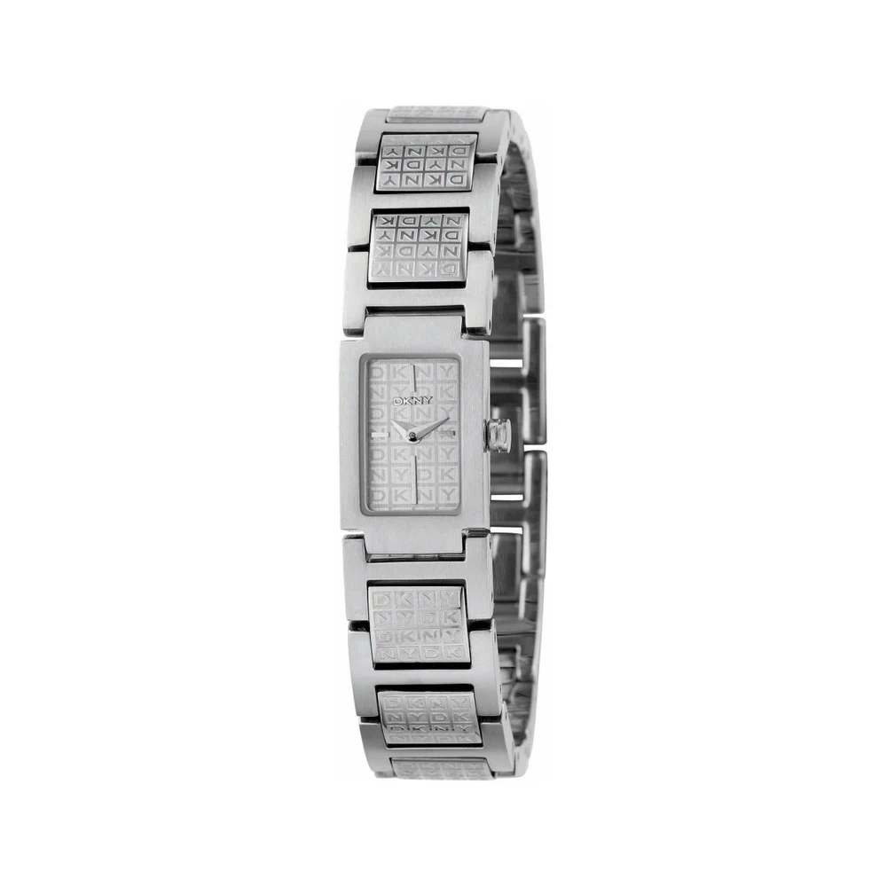 Brojčanik je srebrno-toniran, s višestrukim utisnutim logotipima DKNY za suptilnu teksturu i efekat. Narukvica ima centralne linkove s graviranim „DKNY” logotipima, što dodatno podiže vizualni identitet sata.
